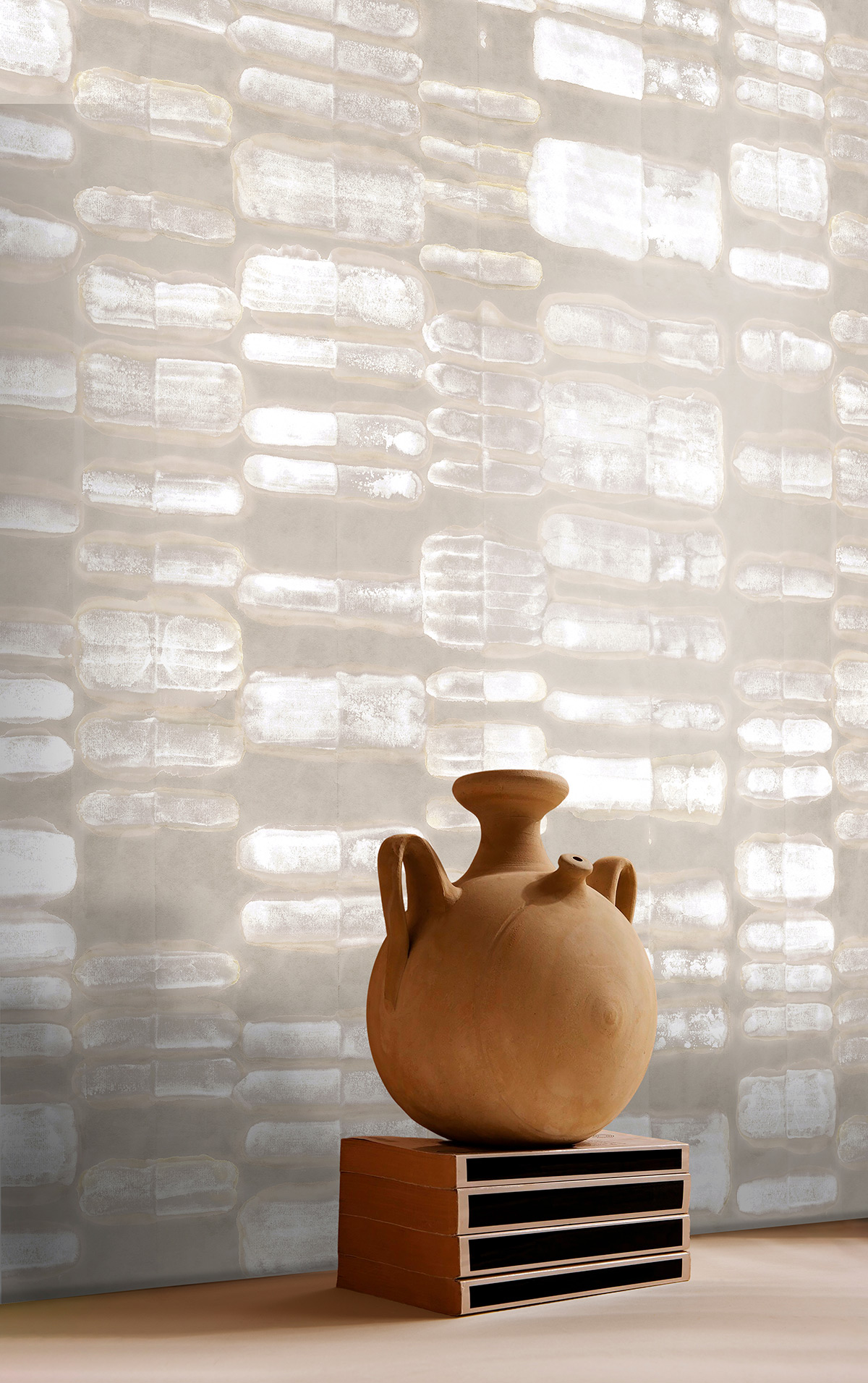 Les formats panoramique, frise et feuille peuvent être combinées ; les feuilles domino peuvent être placées bout à bout, côte à côte, en ‘patchwork’, ou avec un espace entre chacune. Les couleurs ou les motifs de la collection peuvent s’associer. La création d’un décor unique est sans limite.
